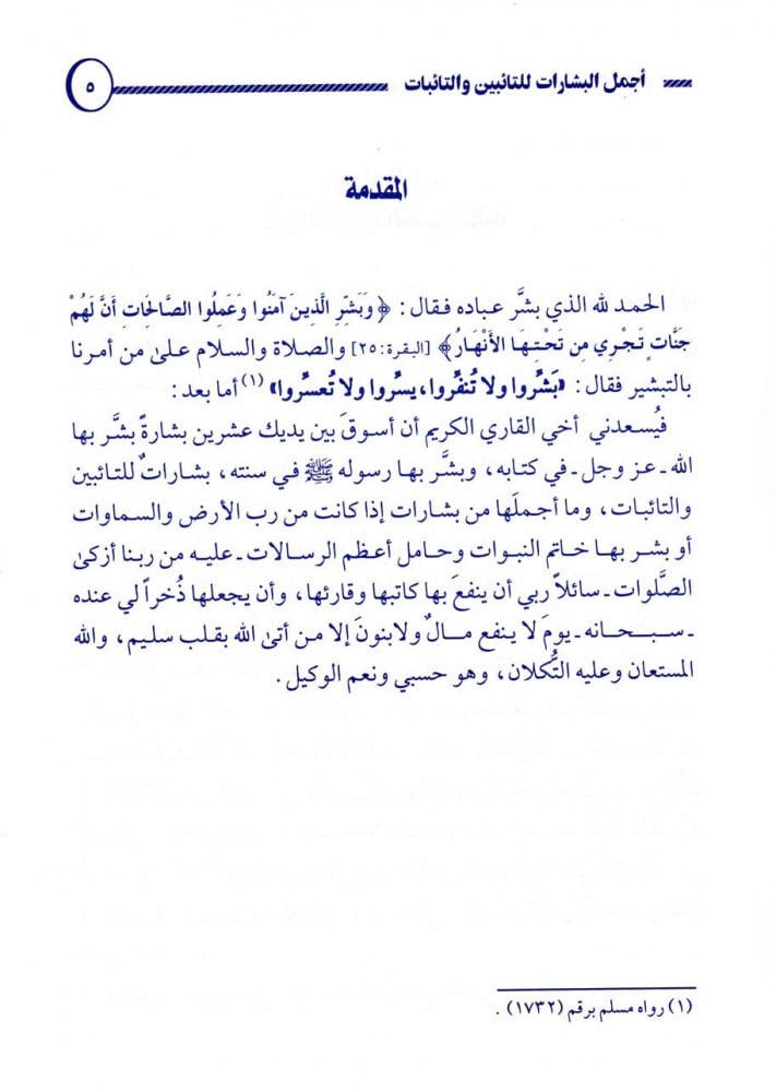 يحوي على عشرين بشارة بشر بها الله عزوجل في كتابه، وبشر بها رسوله صلى الله عليه وسلم، بشارات للتائبين والتائبات.