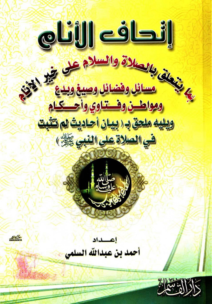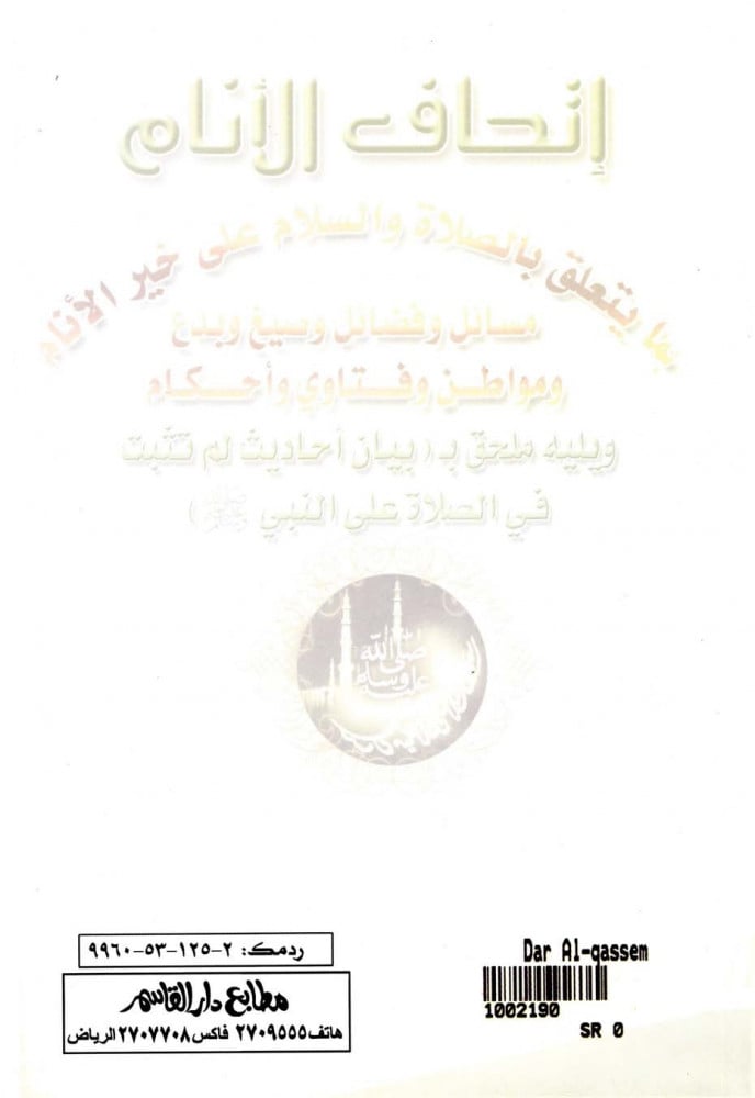 يحوي على إتحاف الأنام بما يتعلق بالصلاة والسلام على خير الأنام، مسائل وفضائل وصيغ وبدع ومواطن وفتاوى وأحكام ويليه ملحق بـ(بيان أحاديث لم تثبت في الصلاة على النبي صلى الله عليه وسلم.
