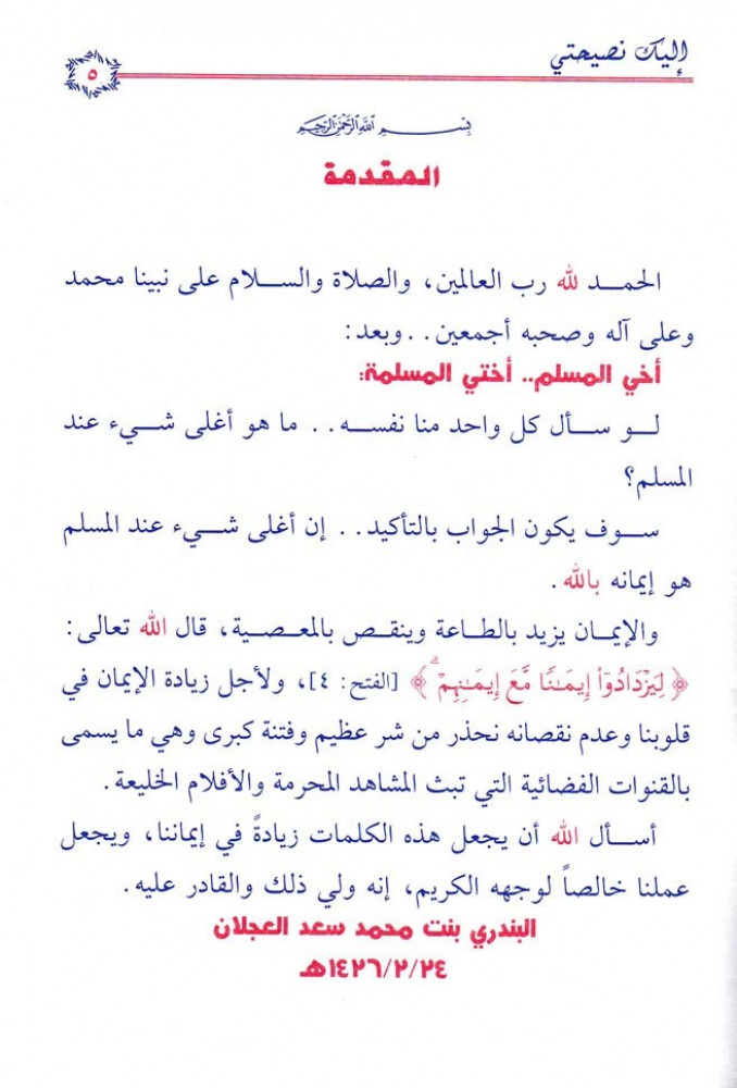 يحوي على نصائح وتوجيهات ولأجل زيادة الإيمان في قلوبنا وعدم نقصانه نحذر من شر عظيم وفتنة كبرى وهي ما يسمى بالقنوات الفضائية التي تبث المشاهد المحرمة والأفلام الخليعة.