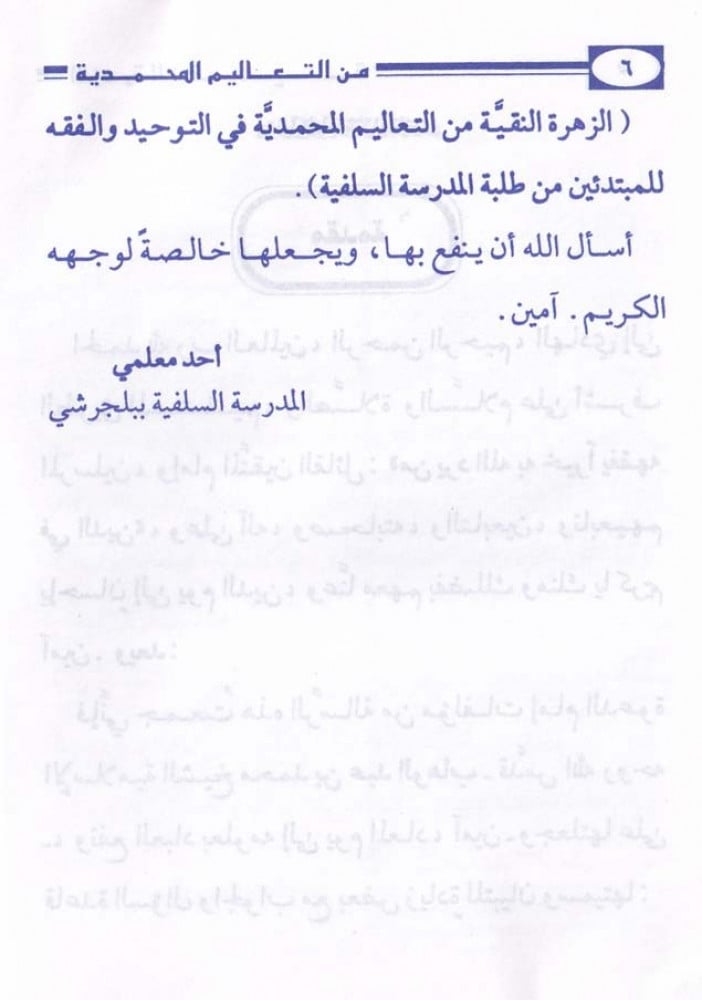 يحوي على الزهرة النقية من التعاليم المحمدية في التوحيد والفقه للمبتدئين من طلبة المدرسة السلفية.