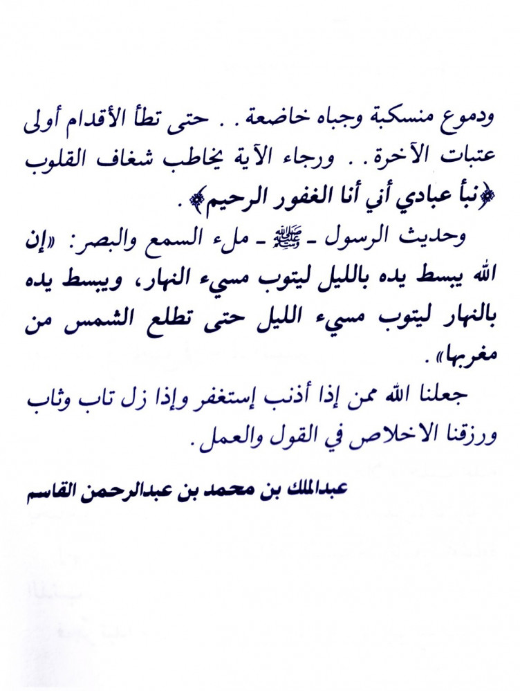 يحوي على إشراقات تبدد ظلام المعصية وتزيل غشاوة الذنب، فجرا تبدأ معه رحلة العودة إلى الله بقلوب منكسرة، ودموع منسكبة وجباه خاصعة، حتى تطأ الأقدام أولى عتبات الآخرة.