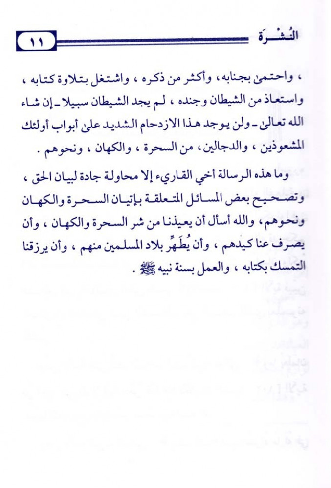 تحوي هذه الرسالة أخي القاريء، إلا محاولة جادة لبيان الحق، وتصحيح بعض المسائل المتعلقة بإيتان السحرة والكهان ونحوهم، والله أسأل أن يعيذنا من شر السحرة والكهان، وأن يصرف عنا كيدهم، وأن يطهر بلاد المسلمين منهم.