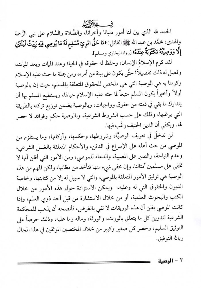 يحوي على الوصية وهي مخلص للحقوق المتعلقة بالمسلم، ما حث عليه الإسلام أولاً وأخيراً يكون المسلم متبعاً لما حثه عليه الإسلام حيالها، ويستطيع المسلم بها أن يتدارك ما بقي في ذمته من حقوق وواجبات، وبالوصية يضمن توزيع تركته بالطريقة التي يرغبها، وذلك على حسب الشروط الشرعية، وبالوصية حكم وفوائد لا حصر لها. ويكفي أن الدين الحنيف رغب فيها.