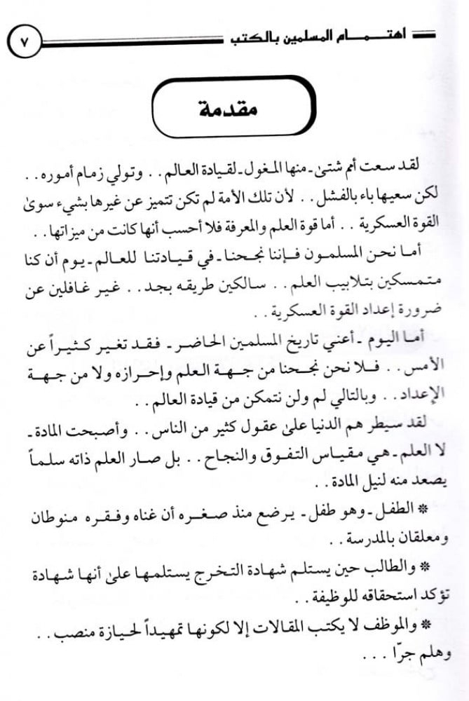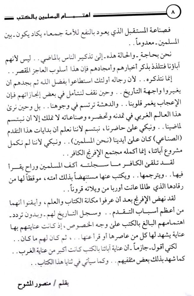 نحن بحاجة والحالة هذه إلى تذكير الناس بالماضي ليس لأنهم آباؤنا فنتلذذ بذكر أخبارهم وأمجادهم فإن هذا أسلوب العاجز المقصر، وبل وحين نرى هذا العالم الغربي في تمدنه وتحضره وصناعاته لا نملك إلا أن نبتسم لماضينا.. ونبكي على حاضرنا، نهض الإفرنج بعد أن عرفوا مكانة الكتاب والعلم، وأيقنوا أنهما من أعظم أسباب التقدم، أن عناي آبائنا بالكتب كانت أكبر من عناية الغرب كما شهد بذلك بعض مقفيهم.