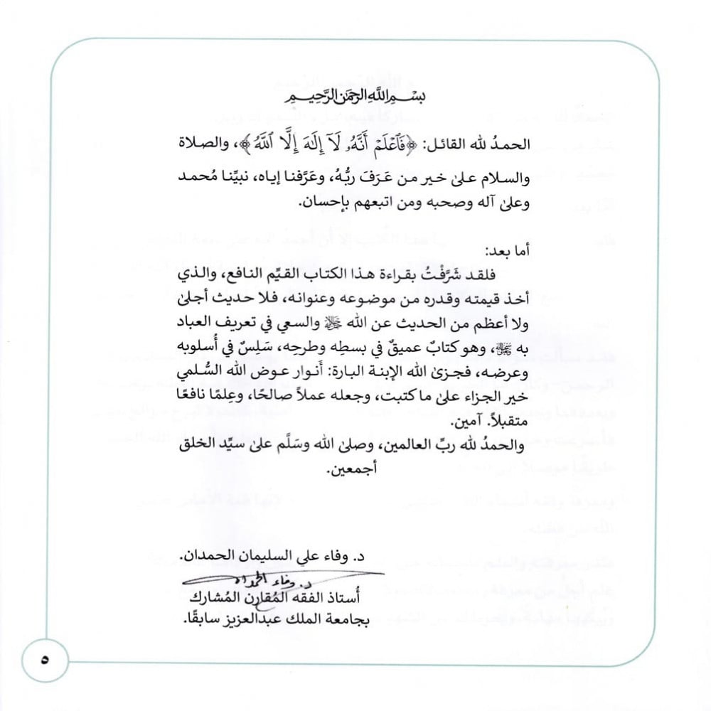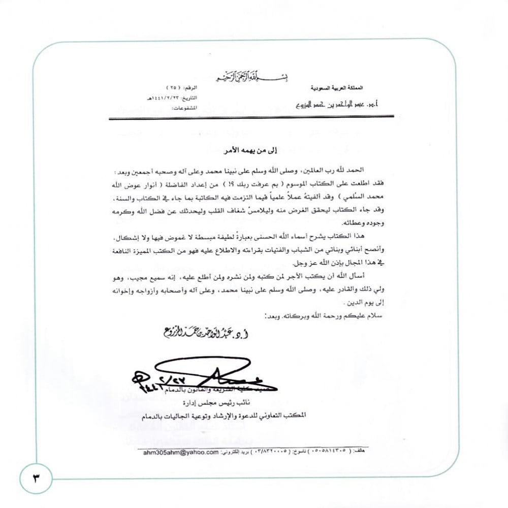 العلم بأسماء الله الحسنى طريقاً موصلاً إلى الجنة، ومعرفة وفقه أسماء الله الحسنى علماً وعملاً، فثغر معرفته والعلم بأسمائه من أعظم ثغور الإيمان وأزكاها عنده سبحانه وتعالى فما من علم أجل من معرفة ربك ومولاك، ولا أحسب علماً يُحيي قلبك، ويُدمع عنيك خشية، ويُبكيها مهابة، ويحوط عن الشهوات والشبهات سوى هذه المعرفة، هذا الكتاب بم عرفت ربك؟ سؤال له جرس في الأسماع، ورعشة في الأبدان، واشتياق في القلوب، وتحبيب في النفوس، سعدت به أرواح، فعرفت طيب الحياة، وكيف لا؟ فمن ذاق عرف، ومن ثبت نبت! ولعلك أيها القارئ أن تسأل نفسك بم عرفت ربك؟ وبأي سبيل أحببته؟ وكيف شغلت وقتك عمرته؟!