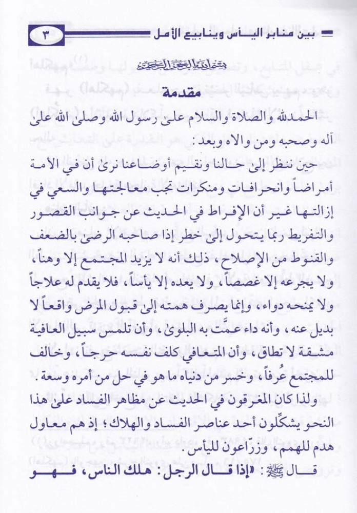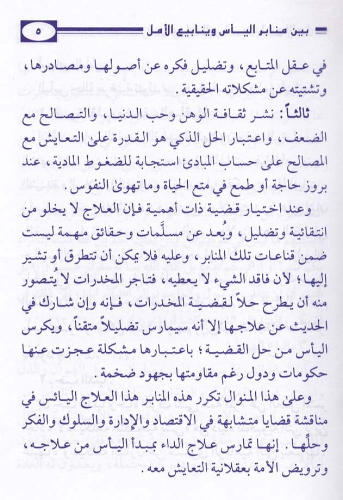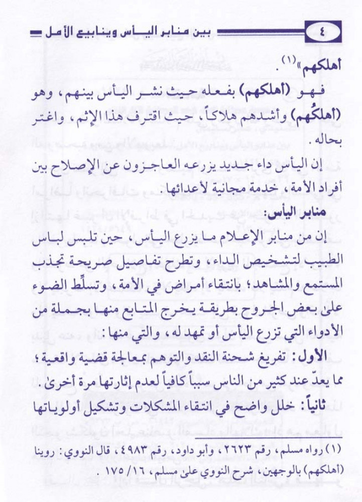 إن منابر الإعلام ما يزرع اليأس، وتسلط الضوء على بعض الجروح بطريقة يخرج المتابع منها بجملة من الأدواء التي تزرع اليأس أو تمهد له، ينابيع الأمل: إن رصيد الأمة العقدي والفكري والتاريخي مليء بينابيع الأمل التي لا تنضب ولا تجف، وكلما ارتوى منها الناهلون فجرت فيهم الأمل والنور واليقين والثقة بالله، وإنمن أعظم منابع الأمل التي ينهل منها العلماء والمصلحون ورواد الأمة؛ المنابع التالية.