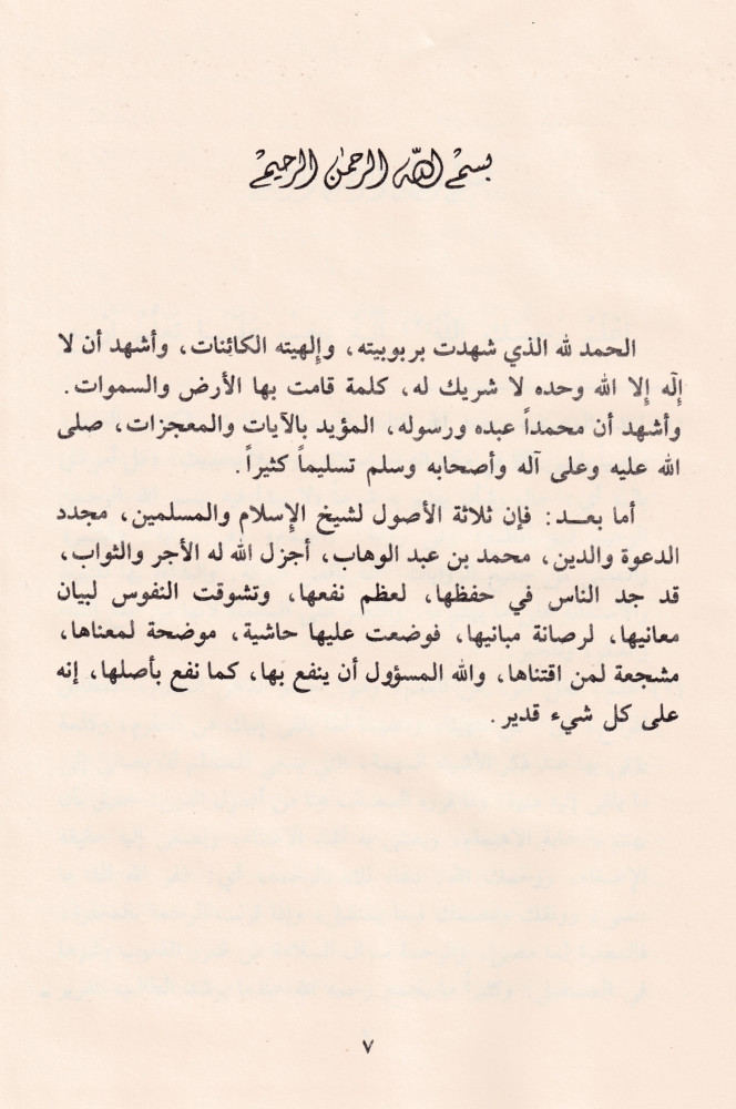 فإن ثلاثة الأصول لشيخ الإسلام والمسلمين، مجدد الدعوة والدين، أجزل الله له الأجر والثواب، قد جد الناس في حفظها، لعظم نفعها، وتشوقت النفوس لبيان معانيها، لرصانة مبانيها، فوضعت عليها حاشية، موضحة لمعناها، مشجعة لمن اقتناها، والله المسؤول أن ينفع بها، كما نفع بأصلها، إنه على كل شيء قدير.
