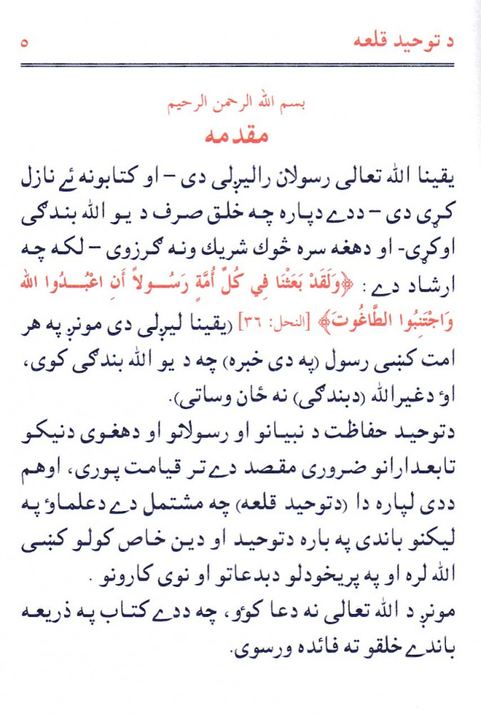 لأجل توحيد الله ـ عزوجل ـ وإقراده بالعبادة خلقت الخليقة ولتحقيقه شرعت كل عبادة، فالتوحيد هو الغاية العظمى والهدف الأسمى والمقصد الأسنى، قال تعالى: ( وما خلقت الجن والأنس إلا ليعبدون) ومن تأمل في حال الكثير اليوم يجد تفلت هذا الأمر من قبلهم في جوانب كثيرة. لذا كان لزاماً علينا أن نسعى إلى إخراج مثل هذا الكتيب الذي يشمل جملة مما كتبه العلماء في التوحيد وإخلاص الدين لله وترك البدع ومحدثات الأمور ـ يقع الكتاب فلي (192) صفحة، باللغة البشتو.