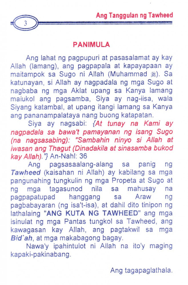 لأجل توحيد الله ـ عزوجل ـ وإقراده بالعبادة خلقت الخليقة ولتحقيقه شرعت كل عبادة، فالتوحيد هو الغاية العظمى والهدف الأسمى والمقصد الأسنى، قال تعالى: ( وما خلقت الجن والأنس إلا ليعبدون) ومن تأمل في حال الكثير اليوم يجد تفلت هذا الأمر من قبلهم في جوانب كثيرة. لذا كان لزاماً علينا أن نسعى إلى إخراج مثل هذا الكتيب الذي يشمل جملة مما كتبه العلماء في التوحيد وإخلاص الدين لله وترك البدع ومحدثات الأمور ـ يقع الكتاب فلي (160) صفحة، باللغة الفلبينية.