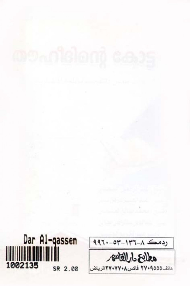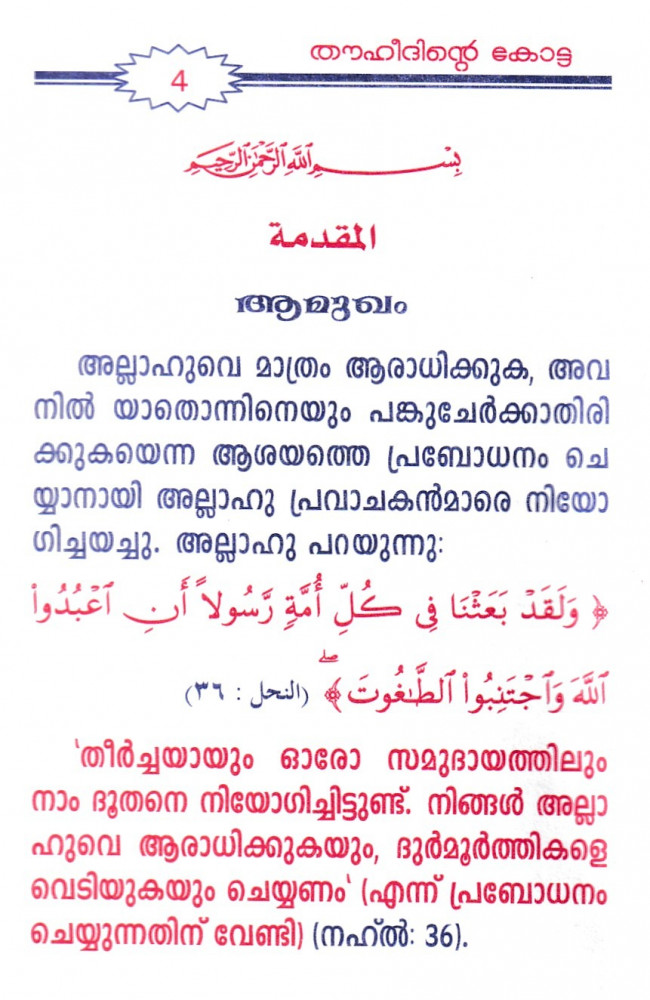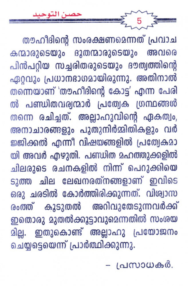 لأجل توحيد الله ـ عزوجل ـ وإقراده بالعبادة خلقت الخليقة ولتحقيقه شرعت كل عبادة، فالتوحيد هو الغاية العظمى والهدف الأسمى والمقصد الأسنى، قال تعالى: ( وما خلقت الجن والأنس إلا ليعبدون) ومن تأمل في حال الكثير اليوم يجد تفلت هذا الأمر من قبلهم في جوانب كثيرة. لذا كان لزاماً علينا أن نسعى إلى إخراج مثل هذا الكتيب الذي يشمل جملة مما كتبه العلماء في التوحيد وإخلاص الدين لله وترك البدع ومحدثات الأمور ـ يقع الكتاب فلي (182) صفحة، باللغة الميلبارية.