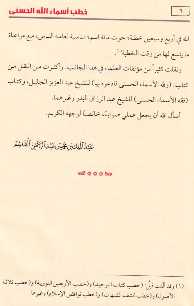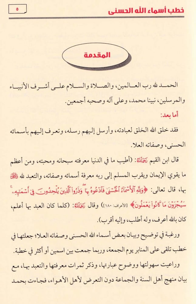 يحوي على خطب تلقى على المصلين يوم الجمعة، تشمل أسماء الله الحسنى.