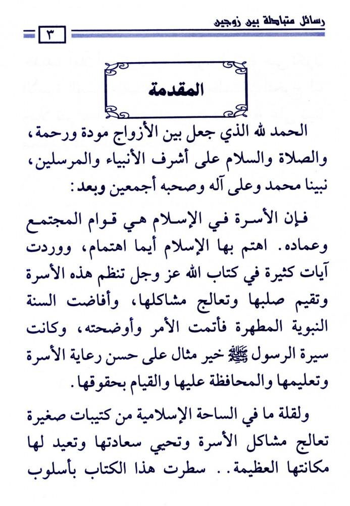 يحوي على رسائل متبادلة بين زوجين، فإن الأسرة في الإسلام هي قوام المجتمع وعماده، اهتم بها الإسلام أيما اهتمام، ووردت آيات كثيرة في كتاب الله عزوجل تنظم هذه الأسرة وتقيم صلبها وتعالج مشاكلها، وأفاضت السنة النبوية المطهرة فأتمت الأمر وأوضحته، وسيرة الرسول صلى الله عليه وسلم خير مثال على حسن رعاية الأسرة وتعليمها والمحافظة عليها والقيام بحقوقها. وفيه عالج مشاكل الأسرة وتحيي سعادتها وتعيد لها مكانتها العظيمة.