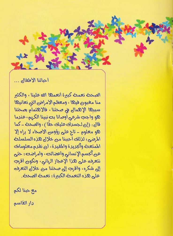 تحوي على الأهتمام بصحتنا هو اجب شرعي أوصانا به نبينا الكريم، عندما قال: (إن لجسدك عليك حقا )، والصحة ـ كما هو معلوم ـ تاج على رؤوس الأصحاء لا يراه إلا مرضى؛ لذلك أحببنا من خلال هذه السلسلة الممتعة والجديدة والمفيدة، أن نقدم معلومات عن الجسم الإنسان وأعضائه، وأمراضه؛ حتى نتعرف على هذا الإعجاز الرباني، ونكون أقرب إلى شكره، وأقرب إلى صحتنا من خلال التعرف على هذه النعمة الكبيرة؛ نعمة الصحة.