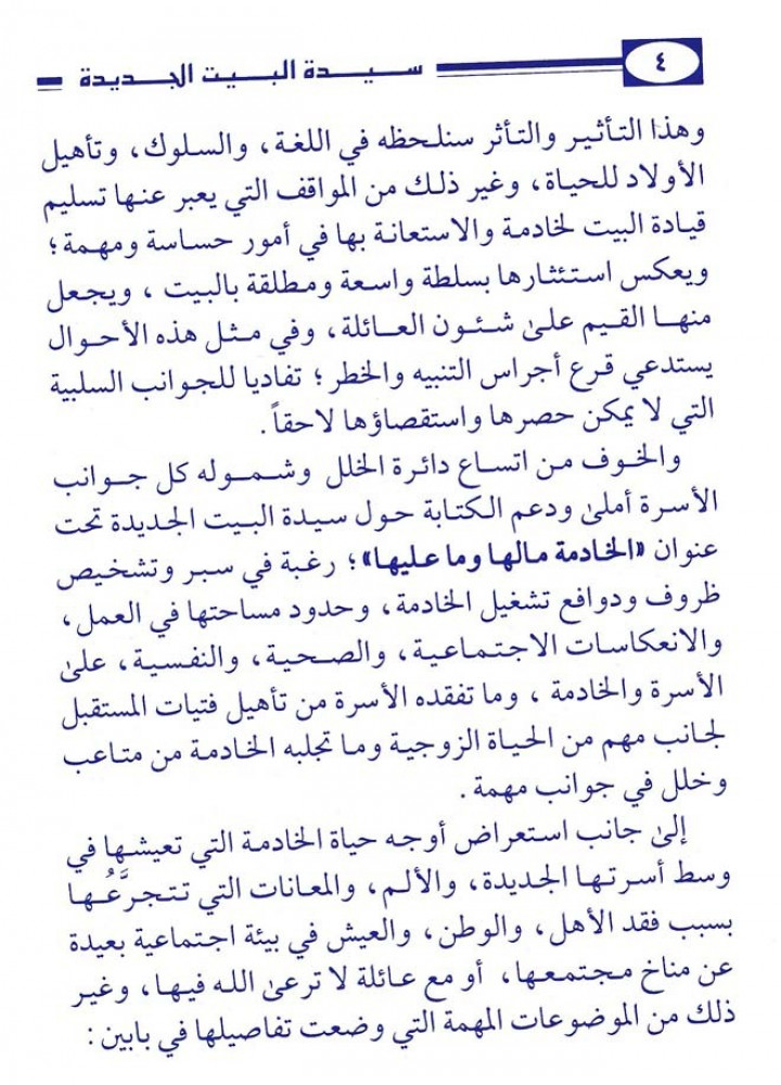 يحوي على ضوابط الخادمة مالها وما عليها.ـ سيدة البيت الجديدة.
