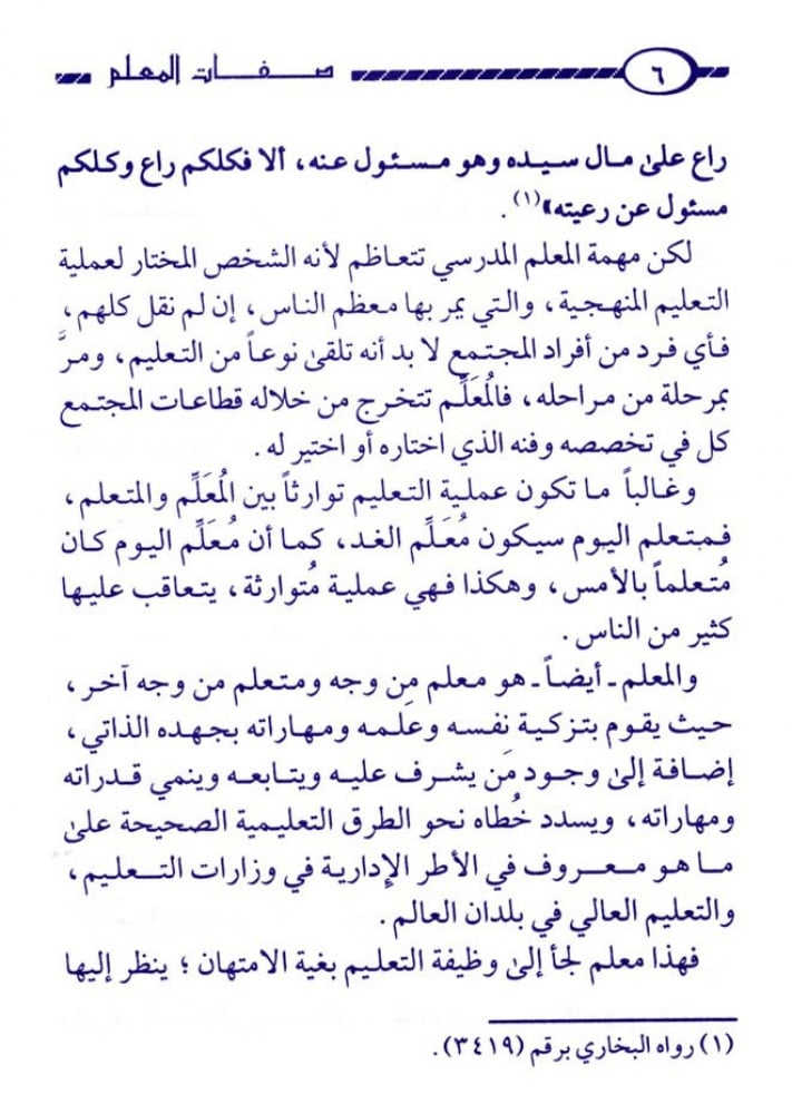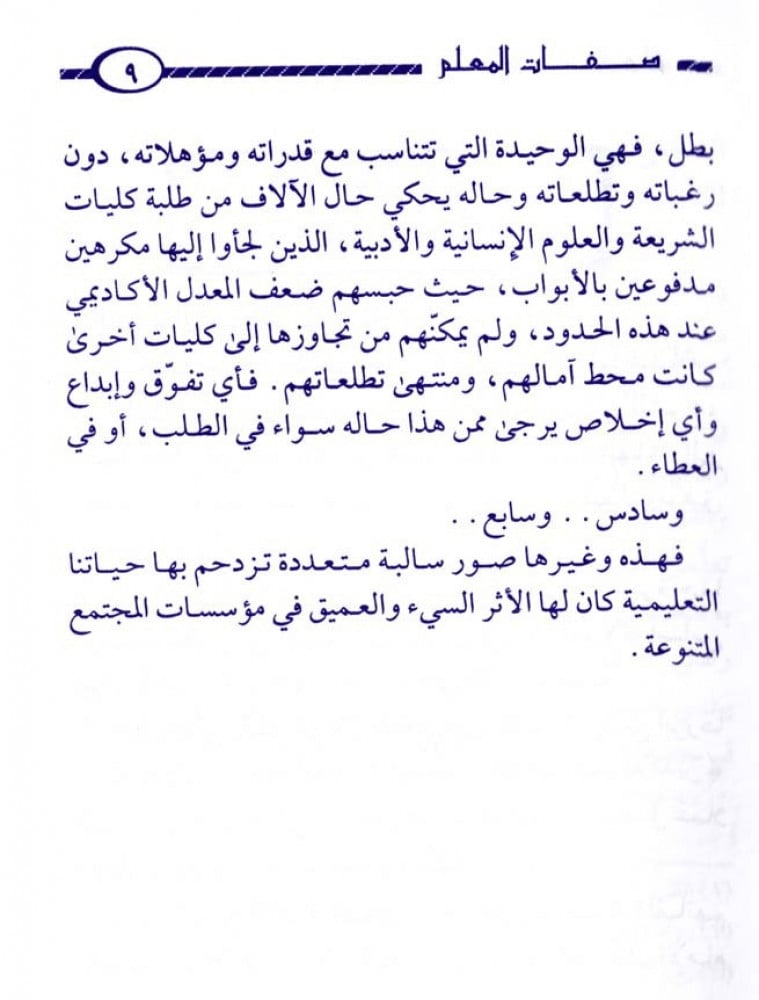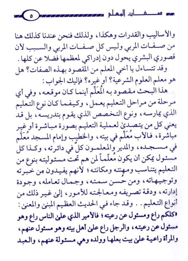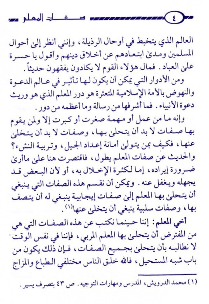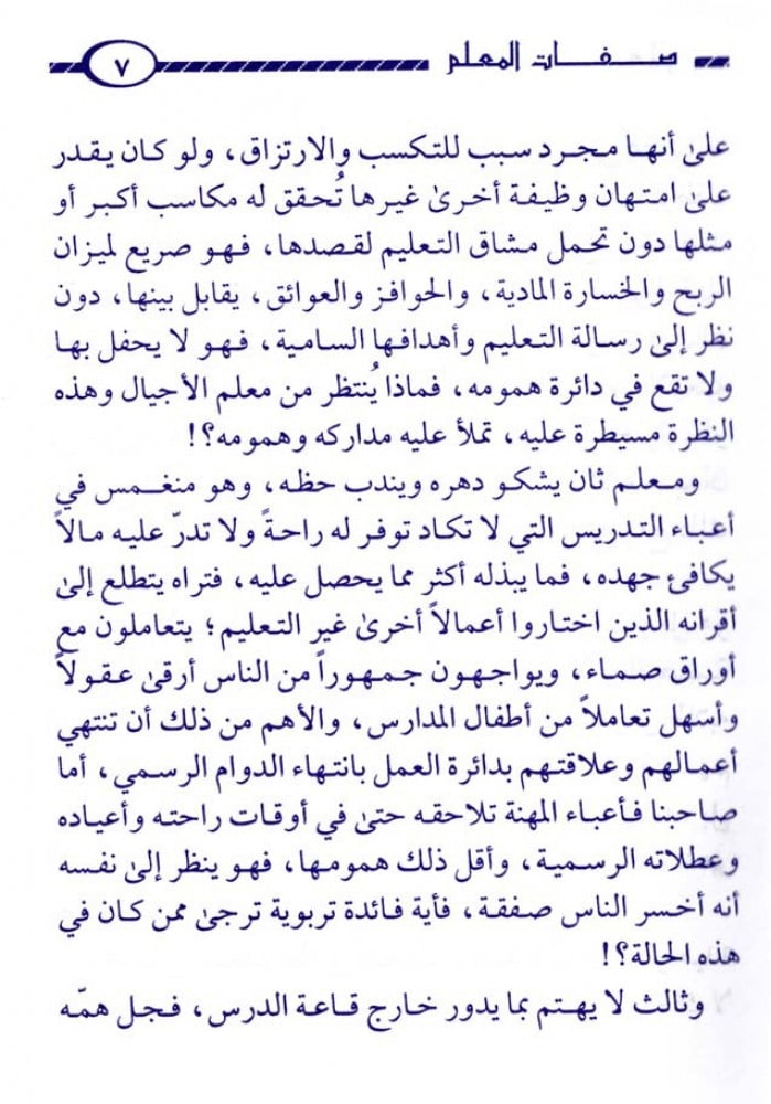 يحوي على الصفات التي هي من المفترض أن يتحلى بها المعلم المربي، المعلم أينما كان موقعه، وفي أي مرحلة من مراحل التعليم يعمل، وكيفما كان نوع التعليم الذي يمارسه.