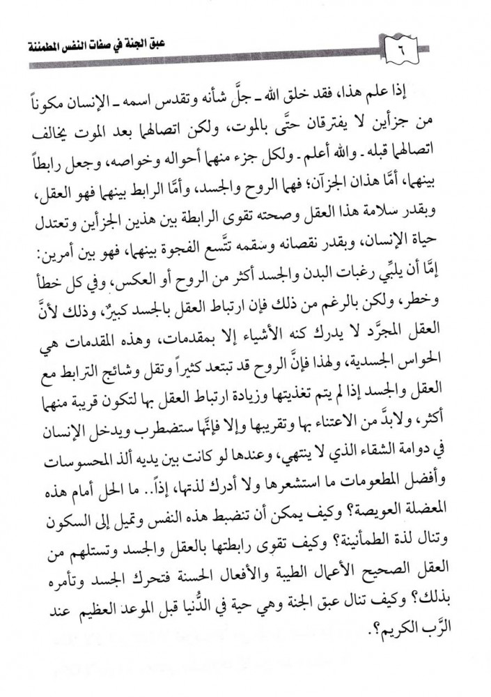 وكيف يمكن أن تنضبط هذه النفس وتميل إلى السكون وتنال لذة الطمأنينة؟ وكيف تقوى رابطتها بالعقل والجسد وتستلهم من العقل الصحيح الأعمال الطيبة والأفعال الحسنة فتحرك الجسد وتأمره بذلك؟ وكيف تنال عبق الجنة وهي حية في الدنيا قبل الموعد العظيم عتد الرب الكريم؟.