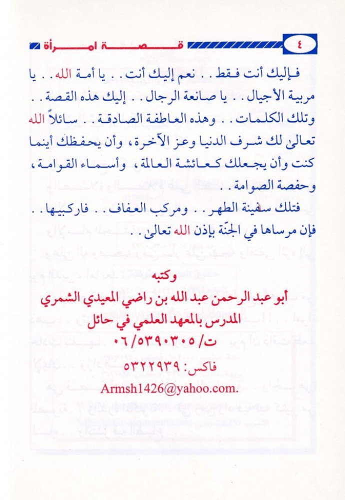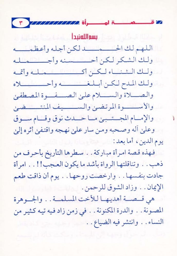 يحوي على قصة إمرأة مباركة... سطرها التأريخ بأحرف من ذهب، امرأة جادت بنفسها وارخصت روحها يوم أن ذاقت طعم الإيمان وزاد الشوق للرحمن، فتلك سفينة الطهر ومركب العفاف فاركبيها فإن مرساها في الجنة بإذن الله تعالى.