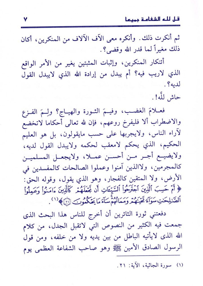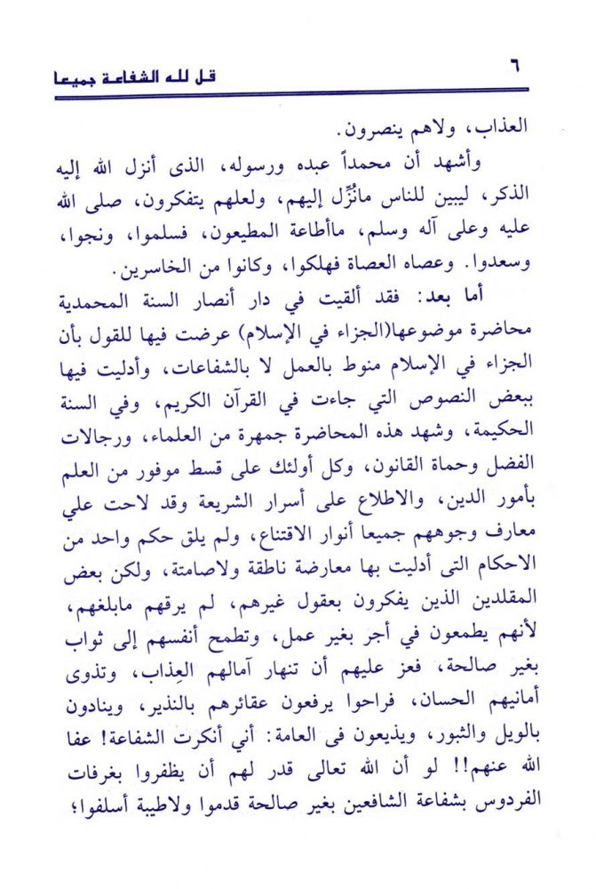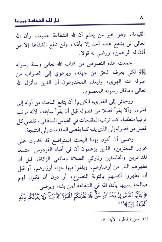 قد قضيت على غرور المغترين، الذين يزعمون أن في أفياء الفردوس متسعا للداعرين والفاسقين وتاركي الصلاة ومانعي الزكاة، قبل أن تطهرهم النار من أوضارهم، ويلقوا فيها جزاء أوزارهم، أوقبل أن يطهروا أنفسهم بالتوبة النصوح، أو دون أن تكون لهم صالحة بسببها يأذن الله في الشفاعة لمن يشاء ويرضى.