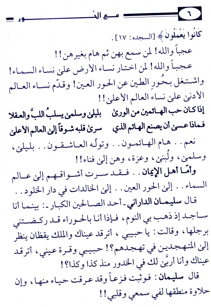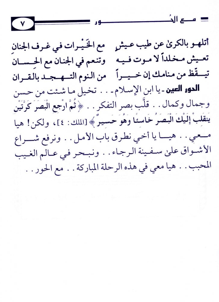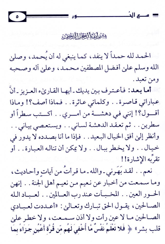 يحوي على أخبار عن نعيم من نعيم أهل الجنة إنهن الحور العين المخبآت عند رب العالمين لعباد الله الصالحين، تخيل ما شئت من حسن وجمال وكمال قلب بصر التفكر، هيا أخي نطرق باب الأمل ونرفع شراع الأشواق على سفينة الرجاء ونبحر في عالم الغيب المحبب هيا معي.