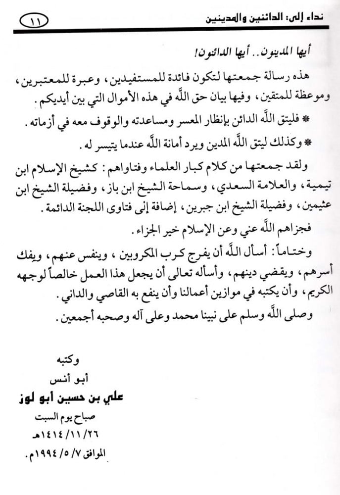 يحوي على نداء إلى الدائنين والمدينين.