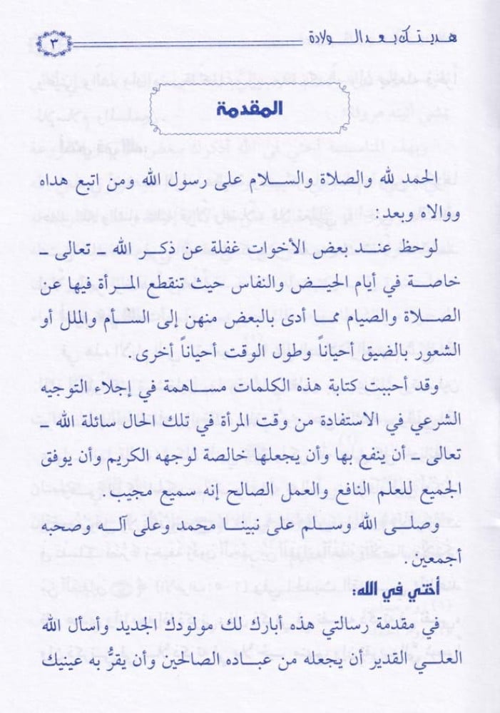 يحوي على توجيهات وإرشادات للأخوات خاصة في أيام الحيض والنفاس حيث تنقطع المرأة فيها عن الصلاة ولاصيام مما أدى بالبعض منهن إلى السأم والملل أو الشعور بالضيق أحياناً وطول الوقت أحياناً.
