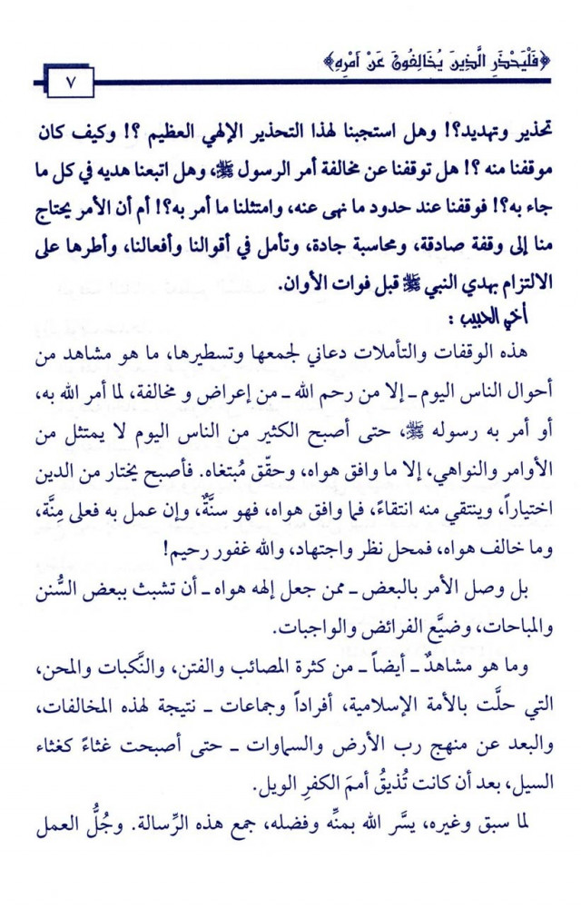 يحوي على وقفات وتأملات في قول الله تعالى: (( فليحذر الذين يخالفون عن أمره أن تصيبهم فتنة أو يصيبهم عذاب أليم)).